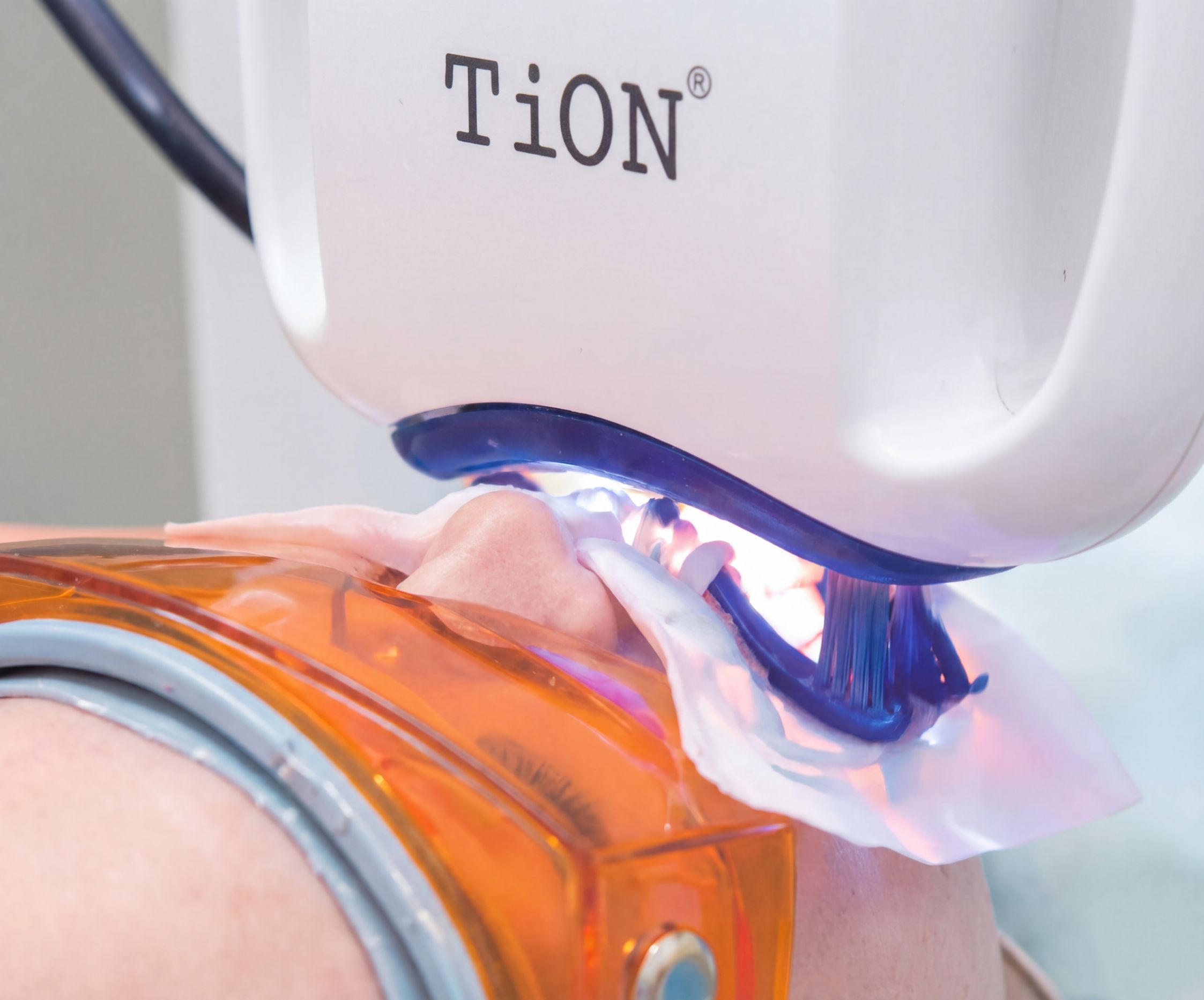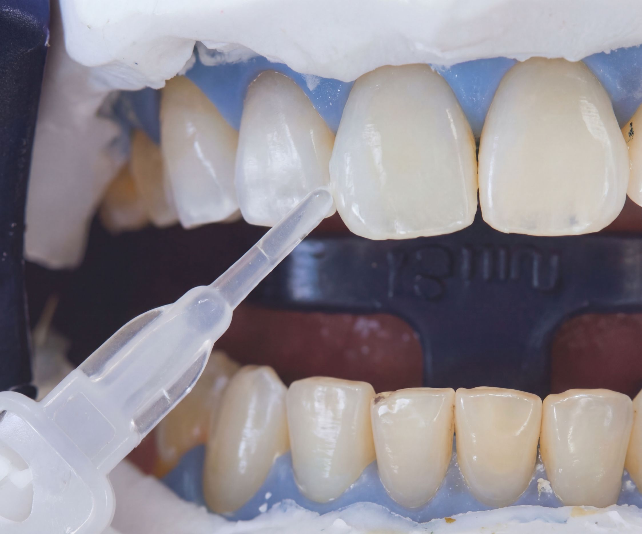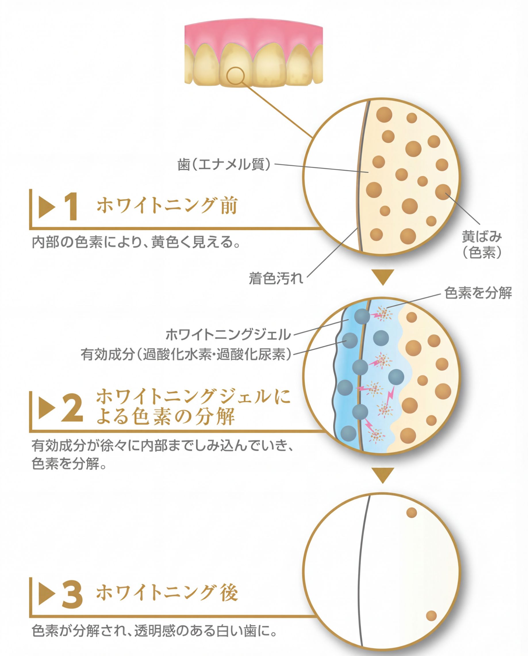 ホワイトニングジェルに含まれる有効成分(過酸化水素・過酸化尿素)が、歯を傷めることなく内部まで浸透し、着色汚れや沈着した色素を分解することで歯を白くします。