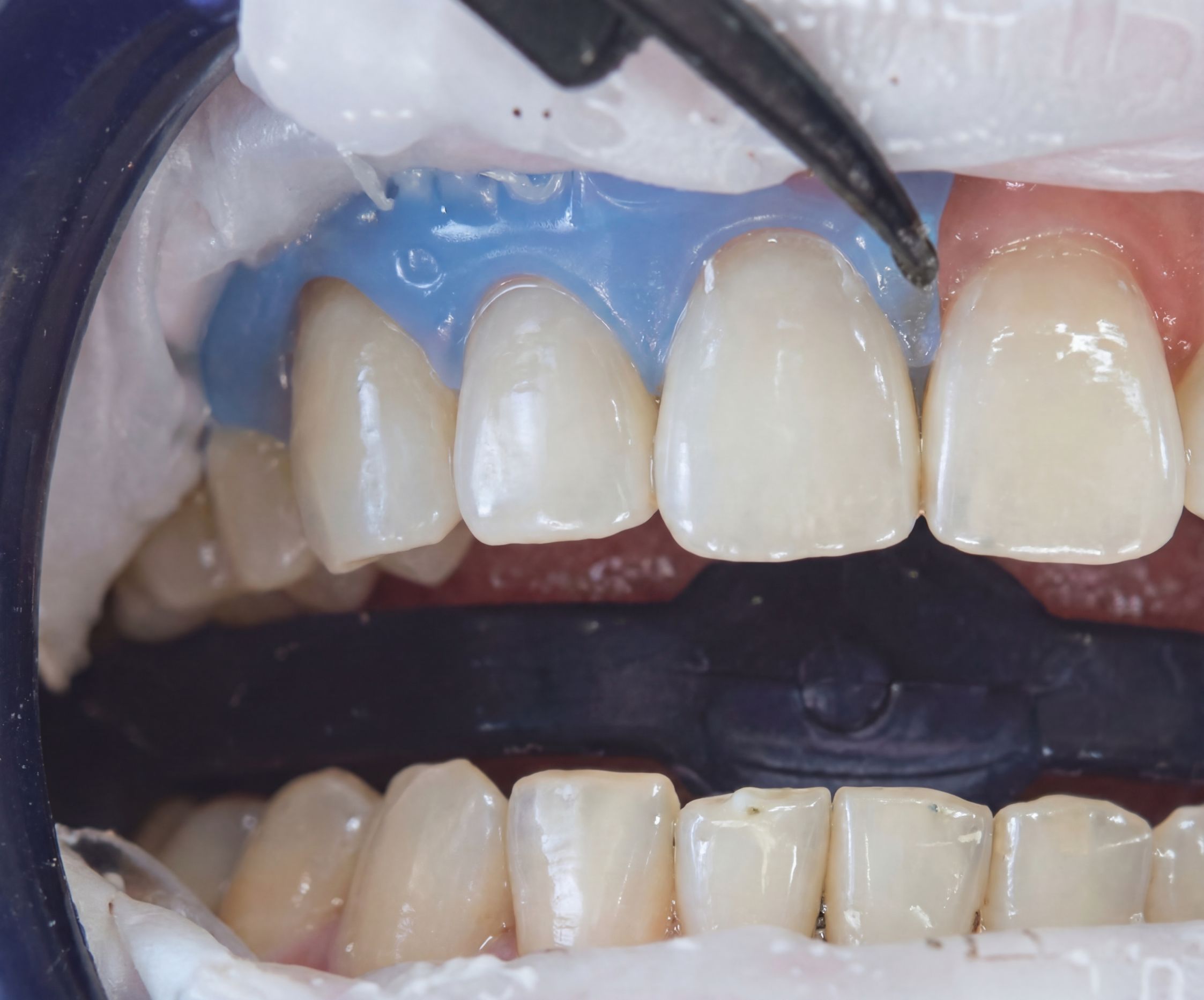 ホワイトニングジェルに含まれる有効成分(過酸化水素・過酸化尿素)が、歯を傷めることなく内部まで浸透し、着色汚れや沈着した色素を分解することで歯を白くします。